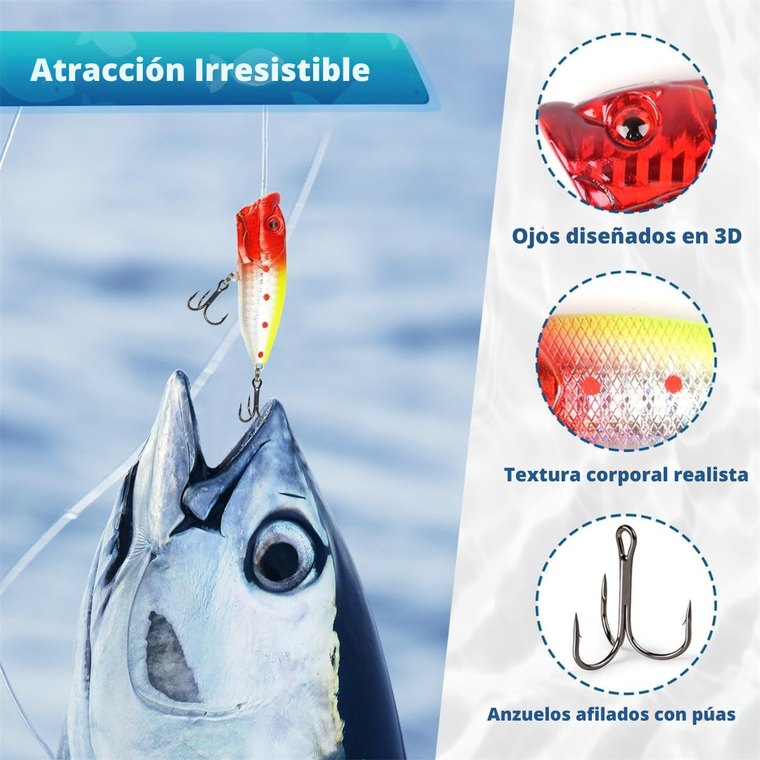 Son señuelos premium con anzuelos afilados, ojos 3D y acabados realistas para atraer peces de verdad.