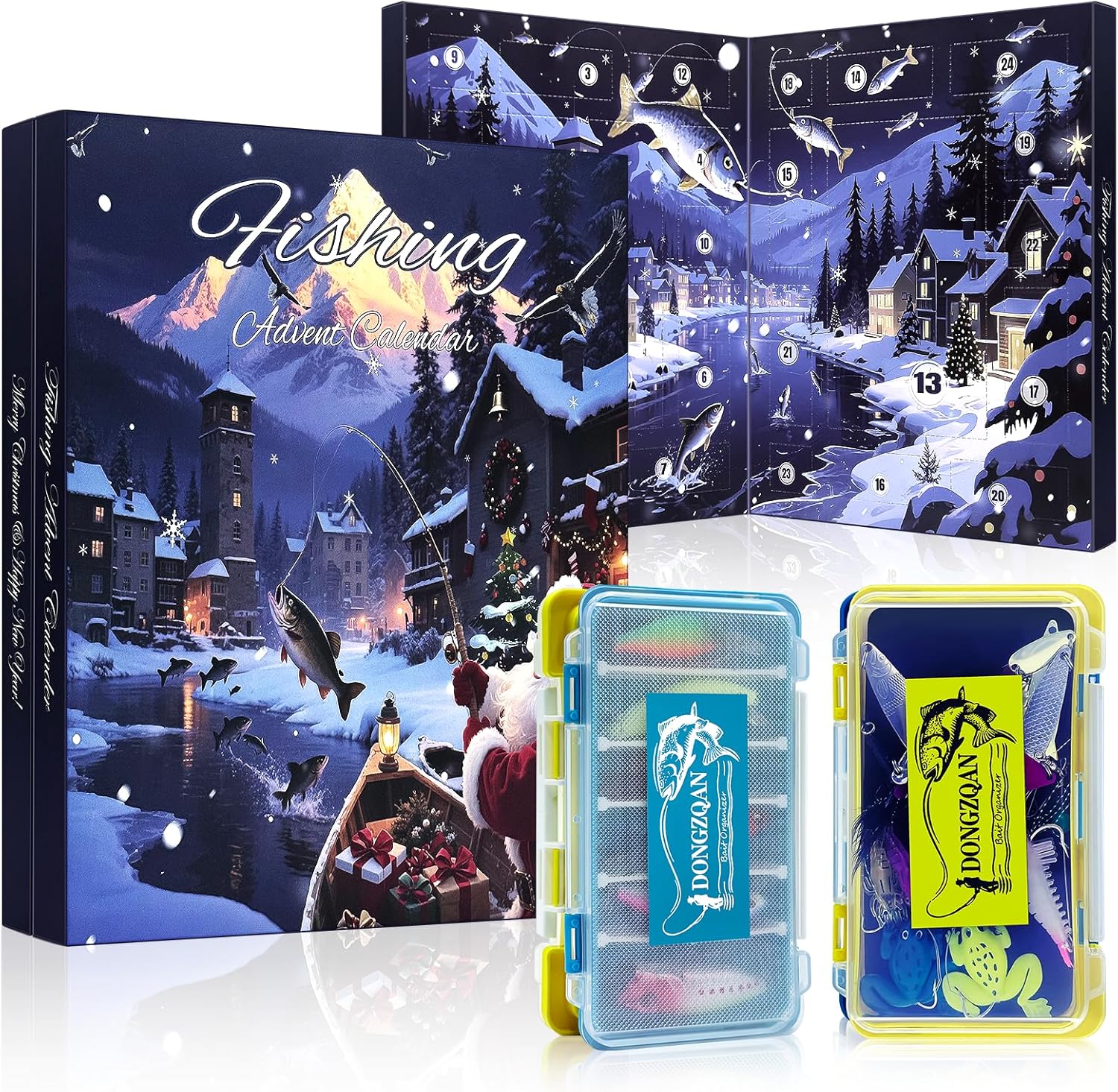 Es una colección especial de 24 señuelos sorpresa para pescadores, presentada en un formato de calendario navideño.